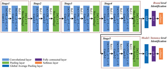 The proposed network shares similar structure with VGG, whereas specific parameters are shown in Figure 5 (p and s represent padding and stride parameters). For model and instance level SCI, more elaborate features should be learned. Although they share the same network architecture, training of instance-level network is based on fine-tuning of the pretrained model-level network. In contrast with this, common features lead to more stable brand level identification. Consequently, only the first four stages are involved in brand-level SCI.