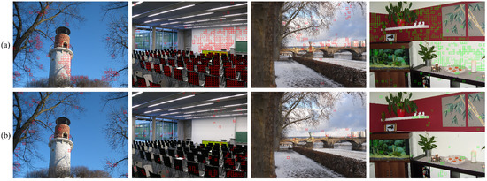 A comparative example of the multiple-criteria-based patch selection is shown in Figure 2, where . Figure 2a visualizes the spatial position of selected training patches. It can be observed that edge-and-textual-based patches (highlighted in red squares) are mainly concentrated along the edge areas of the church and other buildings. Obviously, they are not typical enough to well represent the underlying input image. Network trained only on these patches cannot learn sufficient features to identify all patches during the testing phase. However, being representatives to report the majority of the whole scene, content-based selected patches (highlighted in green squares) cover varying contents covering the main scene of the image such as sky, ground, and the interior of the building. They serve as a good complement to the diversity of the training data, so that richer features could be learned from. Selected patches are shown in Figure 2b for further visual inspection, where the 16 columns corresponding to the centroids that we set for content-based patch selection. We see that the 4 selected patches are similar with each other, which will add to the diversity of selected patches for network training.