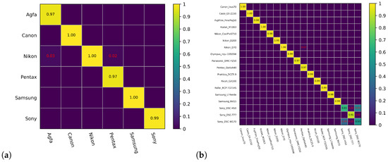 To gain further understanding of the identification performance on specific categories, we present confusion matrix analysis of the proposed method at three levels in detail. It can be clearly seen in the brand-level confusion matrix in Figure 8a that almost all six brands can reach to nearly 100% identification. However, some of the images taken by the Agfa and Pentax brand cameras are erroneously identified as images taken by the Nikon brand camera, indicating the built-in image processing algorithms by Nikon cameras share certain common features with these two brands.