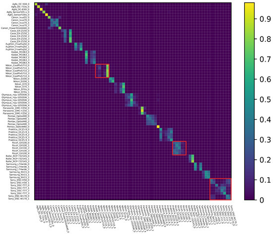 The classification confusion matrix of the instance level identification is shown in Figure 9. As discussed before, instance-level identification is more difficult, especially for a 74-category classification problem. There is an obvious block effect shown in Figure 9; interference between camera instances of the same model is severe (see the Nikon_CoolPixS710, Ricoh_GX100, and Sony cases highlighted in red squares, for example), echoing the low identification accuracy of instance-level SCI (41.54%, as shown in Table 6). The topic of how to design deep structures that can efficiently exploit instance level features is a fruitful direction for future SCI studies.