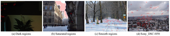 Hereby, we discuss these limitations by some failure cases at the model level identification shown in Figure 11. Although most patches are correctly identified, some patches in dark regions of Figure 11a and a considerable number of saturated sky patches in Figure 11b are misclassified. It was reported in [4] that the instance level camera fingerprint photoresponse nonuniformity noise (PRNU) term is not present in saturated regions. Similarly, little evidence of model level feature is observed in such regions. Meanwhile, identification of a certain number of patches in smooth regions failed, as shown in Figure 11c. This is probably due to the fact that smooth regions are easier to process as compared to edge and texture regions. Consequently, processing algorithms employed by different camera models are not as discriminative in such regions. To address these problems, special strategies for dark, saturated, and smooth regions should be considered. Moreover, as can be clearly seen in Figure 11d, misclassification among the three Sony categories is quite severe. Although it is commonly reported in many literatures [7,9,24], underlying reasons needs to be further revealed.