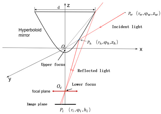 Cylindrical coordinate systems and imaging optical path of hyperboloid panoramic vision systems.