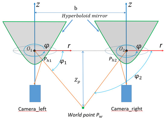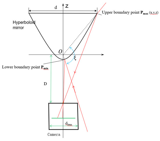 Hyperboloid mirror [141] is an indispensable part of HOVS. Its vertical field of view angle and the basic size of the mirror are the design parameters that must be considered. The hyperboloid mirror is located directly above the perspective camera. According to the figure below, the upper boundary of the hyperboloid panoramic vision systems is determined by the basic parameters of the hyperboloid mirror, and the lower boundary is determined by the occlusion range of the perspective camera and the environment perception platform. For the vertical field of view ξ, the formula is as follows:
