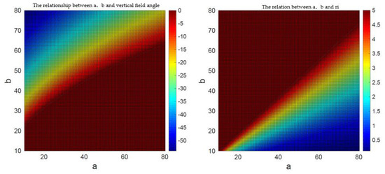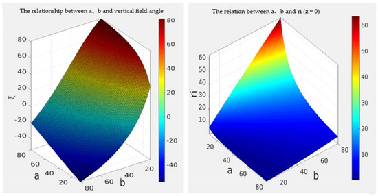 a, b and vertical field angle ξ relationship (left) and the relationship between a, b and ri vertical field angle (right).