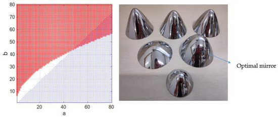 The solution set of condition a and condition b is shown in Figure 3, and the solution set with condition restriction is shown in Figure 4. By solving the intersection of the two solutions shown in Figure 4, the values of hyperboloid mirror parameters a and b can be obtained. In order to minimize HOVS, as can be seen from Figure 5 that a = 48, b = 44, and its physical diagram is shown in Figure 5 (right).