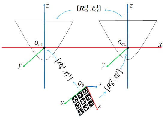 Due to the complexity of the camera projection model and the difficulty of assembling high-quality sensors, the accurate calibration of panoramic vision systems is more challenging than in ordinary vision systems [38]. Scale information is extracted from the environment, and panoramic systems calibration is the first necessary step to determine the mapping relationship between the environment point coordinates and image pixel coordinates, and to correct these errors in the application of panoramic vision systems. The internal and external parameters of the systems can be obtained by calibration. The internal parameters describe the projection relationship of the object point from the camera coordinate systems to the pixel coordinate systems, mainly including focal length, principal point, pixel aspect ratio and skew. The external parameter describes the rotation and translation of the environment point from the world coordinate systems to the camera coordinate systems.