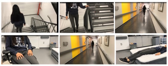 Experimental setup showing some of the performed physical activities in our research protocol: going down stairs, going up stairs, running, sitting, walking, and lying down.