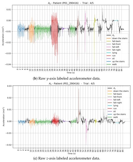 Plots of the raw three-axis labeled accelerometer data corresponding to one trial of a given participant (P01_290416). Each data cluster corresponding to an activity label has a different color on the plot.