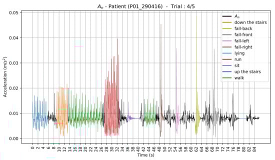 Let , and denote, respectively, the accelerometer data along the x-axis, y-axis and z-axis. We also computed the Euclidean norm of the three-axis acceleration signal (Figure 4):