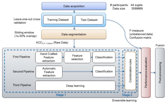 The proposed ensemble architecture is novel because it combines feature engineering and feature learning, and does so with a parallel implementation of cross-validation: it fuses the decisions of distinct classifiers in a manner that increases the robustness and accuracy of the final decision. The method is demonstrated in the important field of health monitoring and rehabilitation. It is tractable so as to easily allow the inclusion of additional classification models. The remainder of this paper is organized as follows: Section 2 gives an overview of sensor-based HAR systems, Section 3 presents a detailed description of the materials and methods used in this study, which includes data acquisition, preprocessing, and the proposed parallel architecture framework. Section 4 describes and discusses the experimental results. Finally, Section 5 contains a conclusion and perspectives for further research.