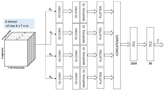 Here, the input data (, , , and ) are chronologically sequenced to form multivariate time series signals (of length N). We segmented these raw and continuous data flow signals using a 1-s fixed-size overlapping sliding window (FOSW), into K fixed-length segments, with a overlap, in order to search for useful patterns in the time series. The window size T = 1 s corresponds to 64 data points and was chosen according to the accelerometer frequency (64 Hz). The segments were stored in a three-dimensional tensor of size , where K is the number of segments, T is the time step (window size), and m is the number of multivariate time series. The three-dimensional tensor was used as the input of the classifier. The tensor-based approach allows one to reduce the computational cost when dealing with big data. Here, , which corresponds to , , and .
