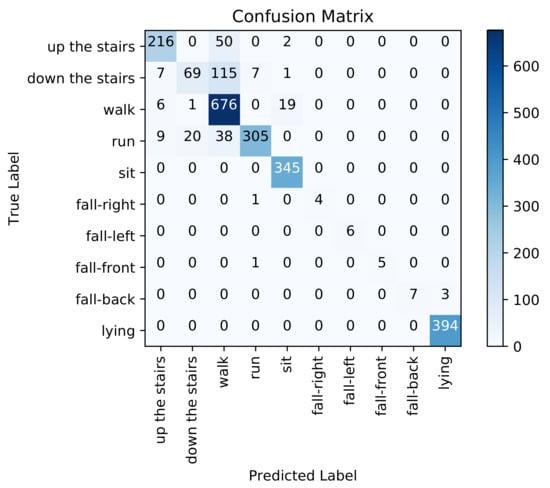 The dataset used in this study is acquired by our research team. It will serve as a basis for the development of human physical activity recognition systems for medical purposes. In the experiments, 44 participants wearing the Hexoskin shirt, performed 10 activities. Before the acquisition, the participant anthropometrics were recorded (i.e., age, gender, height, weight). In order to capture the intra-subject variability and collect a big dataset, each subject was asked to perform 6 trials for each sequence of activities—that is, the participant performed the different activities in a different order in each trial. A sequence of the activities performed in the laboratory environment is: go up the stairs two floors (A1), go down the stairs two floors (A2), walk for 30 s along the corridor (A3), run for 30 s along the same corridor (A4), sit for 30 s on a chair (A5), fall-right, -left, -front and -black (respectively, A6 to A9), and lie intentionally on a mattress (A10) (Figure 2). The 11th class corresponds to transitional activities. This class was removed from the dataset before training.