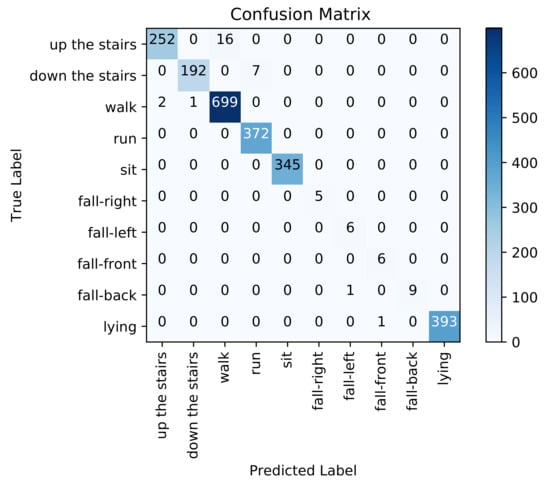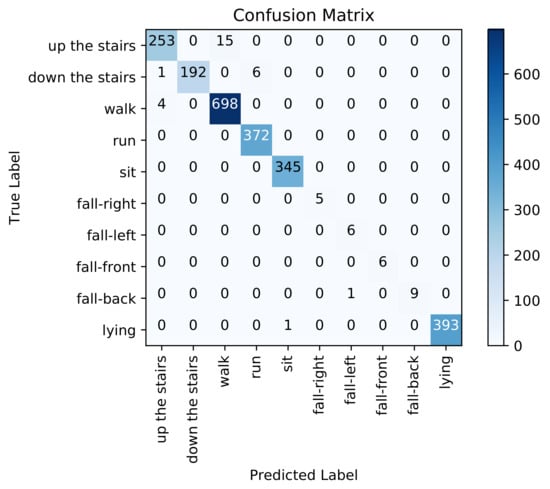 The validation was performed using leave-one-subject-out cross-validation of the dataset [], using the scikit-learn package. The dataset was split according to the number of subjects in the dataset—that is, in each fold the model, was trained on all the subjects except one, which was used for testing. In this case, the number of folds is equal to the number of subjects in the dataset. In order to have an accurate estimation of the proposed method performance, this procedure was repeated until all the subjects had been used as test datasets. Obviously, activity patterns are subject-dependent—that is, the performed activities vary considerably among subjects according to their personal styles and anthropometry, which we refer to as inter-subject variability. Moreover, the way a given activity is performed by a given subject at different times may show variations, which we refer to as intra-subject variability. In our work, the intra-subject variability was considered when the participants were instructed to repeat the sequence of activities a given number of times (i.e., the number of trials). Using the leave-one-subject-out strategy guarantees that data from the same subject are either present in the train set or in the test set. This is a subject independent (inter-subject) validation technique to estimate generalization capabilities of learning techniques, and also allows performance analysis results per subject. We note that the number of samples slightly varies from one subject to another. For instance, for the subject having the reference and for whom we displayed the acceleration data in Figure 3 and Figure 4, there are segments in the training set and 1552 in the testing set.