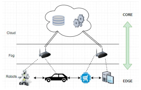 Robots can range from humanoids to sophisticated self-driving automobiles or IoT devices which gather and interpret sensor data locally. Each of the robots must be able to communicate with the others, directly if they are close enough, or through the Fog access points (AP). These robots generate all sorts of data, such as equipped sensors data (light, temperature, gas, etc.), localization information, multimedia data, engine data, and others. In essence, the robots represent the Edge level of our architecture. In the Cloud, all the information and data generated by the robots are collected and stored, but at the same time, the Cloud is also used to process the information.