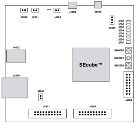 Figure 3 shows the simplified SEcube™ architecture. The development board integrates the SEcube™ chip with several peripherals that allow the user to easily communicate with, program, and debug the chip. The main peripherals in the SEcube™ devkit are: J1000: USB 2.0 to UART, J2000: Ethernet 10/100 socket, J4000: SEcube™ embedded FPGA and CPU GPIOs, J4001: SEcube™ embedded CPU JTAG, J4002: microSD card, J4004: SEcube™ embedded FPGA and CPU GPIOs, J5000: USB 2.0 High Speed, LEDx: Leds, SWx00y: Switches [20].