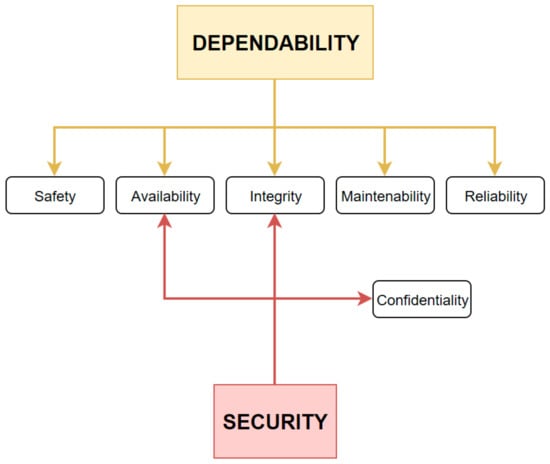 When it comes to analyzing the dependability of a system, we must consider the following six attributes: reliability, availability, integrity, confidentiality, safety, and maintainability [23,24,25]. As one can see, security is not considered being an attribute of dependability. In fact, security is defined by several factors such as preventing data disclosure to unauthorized persons, unauthorized modification or deletion of data, destruction of their integrity. In Figure 5, one can see the link between dependability and security.