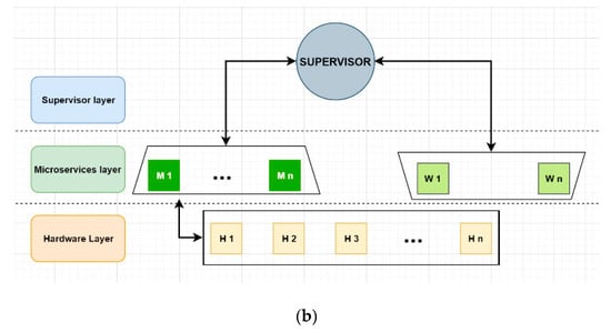 The entities or the microservices from the microservices level oversee interaction between the hardware and the highest layers/levels. We have divided these microservices into two categories: the ones in the first category interact directly with the hardware component and are named Hardware Monitor (M). These configure and manage the hardware components, collect, and preprocess raw data from the devices, they use low level machine code. Essentially, the monitor is powerfully bound to the I/O because its main attribute is to communicate interoperable with the hardware.