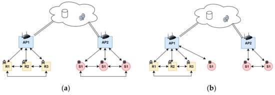 Communication scenario: (a) initial position of each robot; (b) displacement of a robot from one area of Fog coverage to another area (S1).