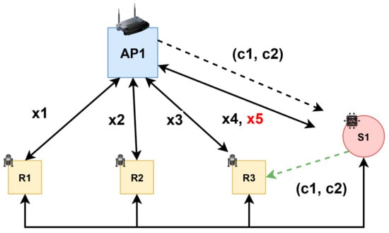 In the concrete situation presented above, AP1 is a trusted center, so it generates the keys of the algorithm. It is also the entity that encrypts the information m. The encrypted form of m is (c1, c2), which is issued periodically. When S1 captures the encrypted information (c1, c2), it sends this message to the R1, R2, R3 components. They stored the message m in their memory. The components R1, R2, R3, using their private keys x1, x2, and x3, respectively, receive and decrypt the message (c1, c2) and then compare the result with the value of m, which they have stored in memory. If the two values coincide, then S1 gets the group access right, as shown in Figure 9. This right is materialized through the process in which the AP1 is transmitting key x4 or keys x4, x5, as appropriate, which it uses as a private key for other information provided by group members. The AP1 can communicate with all members of the group using a private key that he keeps only by himself.