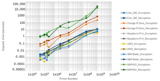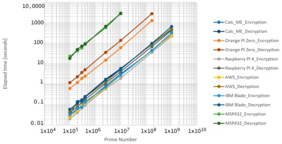 The second set of experiments was designed to test the performance of the algorithm, where the number of entities within the group is equal to 101, and when the prime value p is increased, Table 4 and Figure 12 indicated a dramatic increase in both the encrypting and decryption process times. Moreover, as the prime number increased, clearly some of the devices used in the experiments (Orange PI Zero and MSP432) have exceeded their processing capabilities and there were no longer able to encrypt or decrypt the message.
