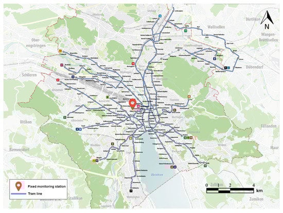 Location of the fixed station and the tram paths in the city of Zurich.