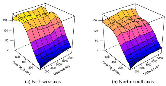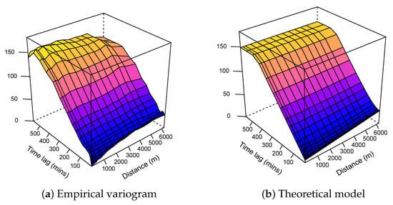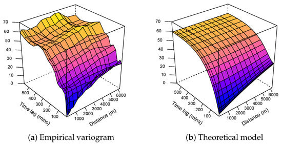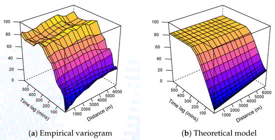 Knowing that, the maximum distance between two points in this study was 12.8 KM; variograms were, thus, limited to 6 km. As for the temporal limit, knowing that months of data were available, restricting this study to half of this temporal distance was neither possible in practice nor advantageous. The retained limit was set manually by increasing the time limit step by step until a sill appeared in the variogram.