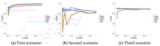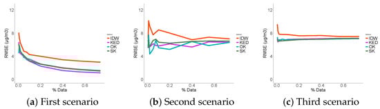 The three approaches were compared to one deterministic interpolation technique, here considered as the reference (IDW), in the three scenarios. The evaluation of the result of each of them used the following three performance indicators: