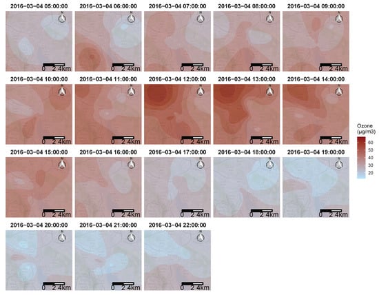 To answer the objective of creating pollution maps, The KED algorithm was applied using every data point available from the mobile sensors, as well as the fixed monitoring station during one day. Figure 12 shows an example of 17 h of the resulting maps for 4 March 2016. Figure 12 display only the resulting ozone concentration from 5 a.m. to 10 p.m., when all four mobile sensors were active. The method succeeded in identifying areas with high ozone pollution in the city of Zurich, considering that only four mobile sensors were used. One of the important points that can be observed in Figure 12 is that the typical mid day spike of ozone concentration was clearly visible, followed by mostly very low concentrations during the evening and night.