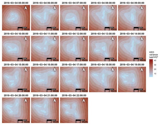 Resulting variance estimator maps for the KED estimator in Zurich, here shown for 4 March 2016. From 5 a.m. to 10 p.m.