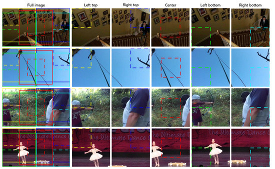 The neural network is fed with video patches, which are the randomly cropped samples from the input video frames. About 30–80% of the frame area may be lost in the cropping process. In the worst case, the cropped samples may have nothing to do with human action. For example, Figure 1 shows several multi-ratio corner cropping results using the four corners and the center of the video frames for randomly patch cropping with size ratios of 1 and 0.5. It is not difficult to observe that the process may generate many non-informative samples which are the patches covering only a small part of the foreground or only the background of the input video. If these samples are associated with the action labels of the input video, they would become noisy samples for neural network training because the context of these samples is not closely related to the corresponding action labels. In addition, it was verified in [23,24,25,26] that such noise samples may reduce the training performance of neural networks due to the introduction of wrong gradients direction.
