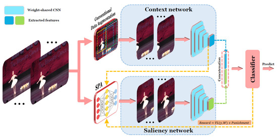 The key to achieving good performance of the proposed ASNet is to provide action-related salient video patches for the saliency network. This is realized through the deep reinforcement learning-based SPA, which can automatically extract salient patches from the input video clips, and then provide ASNet with critical information. However, it is not easy to extract salient patches from input video clips without additional labels and identify the most suitable region for action classification. To achieve this challenging patch extraction, a reinforcement learning agent relying on the deviation of the action classification loss as a reward is used. The cropping process of the salient patch is formulated as a Markov decision process, which uses a weakly supervised learning method to crop the patch without extra labels. The reward of SPA is calculated based on the loss of the fully connected neural network classifier , which uses concatenated features [4,54] from the context network and saliency network as shown in Figure 2.