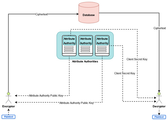 Let us note that in large-scaled distributed environment, the traditional ABE schemes with single attribute authority might face some efficiency and scalability issues. In order to reduce the workload and attack risk of single authority, Chase [37] proposed Multi-Authority Attribute Based Encryption (MA-ABE), which has n attribute authorities and one central authority, which does not monitor any attributes. Furthermore, Lewko and Waters [38] proposed the Decentralized Attribute Based Encryption (DABE) that removes the centralized authority, without any requirement for global coordination between distributed attribute authorities. As it is illustrated in Figure 1, A user gets the public keys of the relevant attribute authorities and encrypt the plaintext using these public keys. On the other hand, a user wants to decrypt the ciphertext has to prove its attributes to the relevant attribute authorities and asks for corresponding decryption key. The decentralized ABE scheme [38] is composed of the following five algorithms: Global Setup(), Attribute Setup(), Key Generation(), Encrypt() and Decrypt().