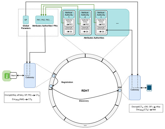 There are four main sets in Attred: set of clients (), set of objects (), set of gateways () and set of attribute authorities (). The finite set consists of the IoT clients in the network, and each IoT client has a set of attributes. These attributes may be its location, its employment status and so on. An object is any device in the IoT network with proper computational power that handles a resource . Each resource is defined in the network by a number of attributes that indicates its different properties, e.g., its type, its provided service, and so on. Members of C and O are connected to different IoT gateways in . We assume that there is a secure link between the members of C and O on one hand, and their directly connected IoT gateways on the other hand. A gateway w and depending on its location may handle different number of nodes from sets and . The finite set consists of the attribute authorities in the network. An attribute authority is an independent entity responsible to generate the public/private keys of attribute i. There is no centralized entity in , and any entity that manage an attribute can have an attribute authority of that specific attribute as part of . Attred utilizes the defined workflow of Kademlia [17] implementation of p2p scheme with RDHT [32] that provides a structured method of addressing and discovery of the peers. The members of represent the peers in the RDHT overlay.