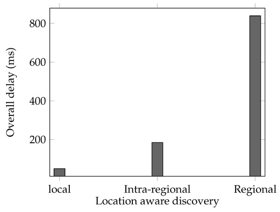 The system performance has been tested using a simulated network with 2 billion IoT gateways. The IoT gateways are distributed and grouped in 200 region sets with 200 regions per region set (i.e., overall 40,000 regions with 50,000 IoT gateways per region). Figure 6 shows the resource discovery latency in a local discovery (i.e., two nodes in the same local region), intra-regional discovery (i.e., two nodes in two different regions that are within the same region set) and regional discovery (i.e., two nodes in two regions that are in two different region sets). We assumed that no churn occurred and no cache has been used in Attred during the test.