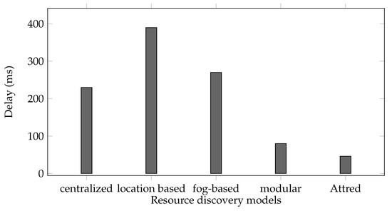 As part of the evaluation and to study the efficiency of Attred, it has been compared with the centralized service discovery [3], location based distributed discovery [7], fog based distributed discovery [9] and modular discovery [20]. The direct matching scheme that has the minimum response time in the centralized model [3] has been used. The specifications of each of the models has been listed in Table 3 and the resource discovery delay has been illustrated in Figure 7. Evaluation shows that Attred meets the latency requirements in resource discovery for IoT when it is compared to different resource discovery models.