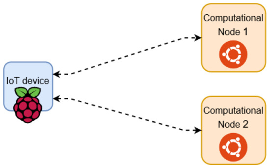 It is feasible to implement and adopt ABE in number of IoT devices [46], but due to its high computation power, it takes a considerable time to perform the ABE operations in those resource constrained devices. The effectiveness of the proposed distributed computation in Attred was evaluated with a hardware setup consisting of a Raspberry Pi Zero ARM11 running at 1 GHz as the IoT device, and computers with 64-bit computing architecture and Intel Corei7 CPU running at 1.8 GHz with Ubuntu 20.04 as the computational nodes. Figure 8 illustrates the network configuration. The model was implemented in Python. Based on a note in [38], to improve the implementation efficiency prime order group was used.