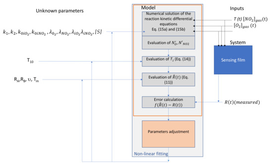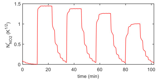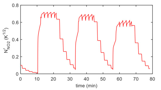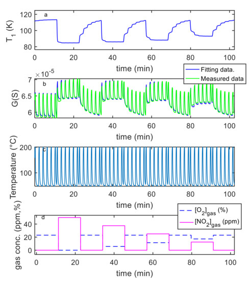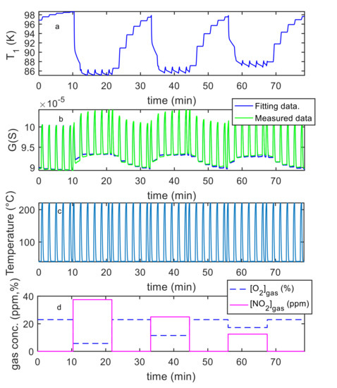 In this paper, the estimation of these parameters, described in Figure 1, is treated as a classical system identification problem. The model structure is fixed and coincides with the one theoretically derived in the previous subsection. Parameter identification is performed to obtain the coefficients in the functional system exploiting measurement data. The approach followed by the authors in this and other papers [29,35] is to carry out experiments on the system to collect data, through which the needed parameters are then estimated. It is known that, to achieve experimental identifiability, the dataset must be «sufficiently informative» concerning the parameters of interest. Therefore, the input signals used to excite the system (temperature and gas concentration) must ensure experimental identifiability (so they must be «exciting» in a suitable sense). In Figure 1 the identification procedure is described in detail. There, it is summarized that the model’s inputs are the three dynamical signals: working temperature and gas concentrations (NO2 and oxygen). To summarize, to obtain a reliable parameter estimation, it is essential to select a measurement protocol ensuring large and fast variations of all the input signals in order to excite the different dynamics involved in the sensing film response to NO2.