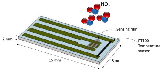 The sensing films, based on MWCNT networks and used to test the applicability of the proposed model, were deposited on an alumina substrate equipped with screen-printed silver electrodes and a platinum resistive temperature sensor (Pt-RTD) (as described in [28,36]). A heater was realized on the back side of the substrate with the same technique. The size and the structure of the device are shown in Figure 2. As it can be seen, this structure allows for testing the behavior of the material at a temperature measured with high accuracy, since the temperature sensor is deposited on the same substrate and very close to the sensing film.