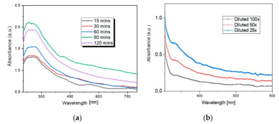 UV–Vis spectra of MWCNT–COOH isopropanol dispersed solution: (a) different dilutions; (b) different sonication times for the 25× diluted sample.