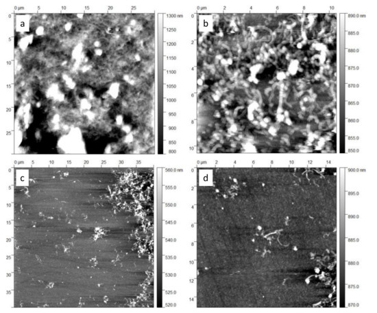 Atomic force microscopy (AFM) images of two MWCNT–COOH films on a glass substrate: drop-casted film (a,b); dip-coated film (c,d). Images (b,d) are detail magnifications.
