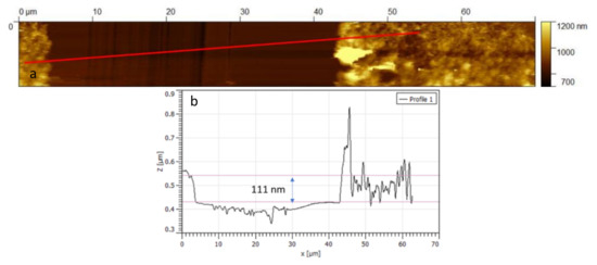 Figure 5a,b show some AFM images of the drop-casted film where the formation of a continuous film and the presence of MWCNT networks with a rather homogeneous distribution can be observed (roughness in Figure 5b is 12 nm). The presence of large agglomerates can be noted, that probably were formed due to the fast evaporation of isopropanol after the deposition on the substrate. In Figure 5c,d, images of the dip-coated sample are reported (roughness in Figure 5c is 7 nm), where individual structures of CNTs can be observed, confirming the expected sizes without significant changes or shortening effects due to the dispersion procedure. Moreover, the thickness of the deposited film was measured by AFM analysis, as shown in Figure 6, and a value of approximately 110 nm was estimated.