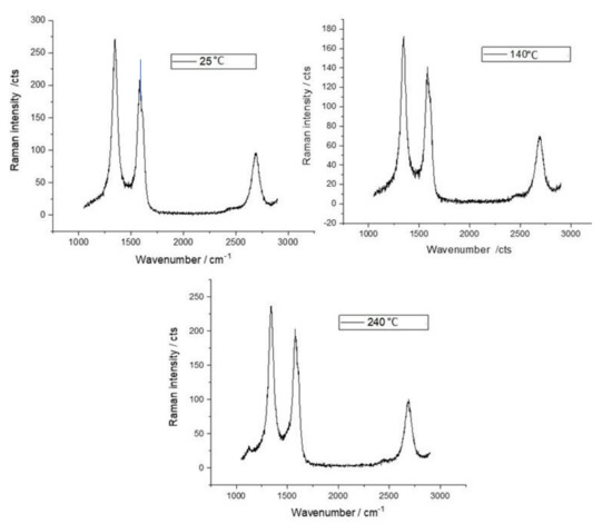 Finally, the stability of the material vs. temperature was tested through Raman spectroscopy. Raman spectra were obtained by Horiba Xplora instrument at a wavelength of 532 nm in 2 min of acquisition time. For Raman measurements, samples were prepared by drop-casting 10 µL of the MWCNT–COOH based solution on a silicon substrate, and dried at room temperature (as for the sensing film preparation). Measurements were taken after heating the samples for 20 min at different temperatures, i.e., 140 °C, and 240 °C.