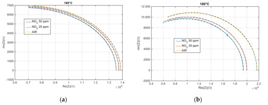 The impedance spectra analysis pointed out that, in the considered working conditions, the tested devices act as resistances with small fixed parasitic capacitances (of about 6 pF) in parallel, indicating that the electrodes/film interfaces provide negligible contributions. Figure 8 shows, as examples, the measured impedances in the complex plane, in dry air and in the presence of different NO2 concentrations at the fixed and controlled temperature of 180° for the pure MWCNT–COOH based device (Figure 8a) and of the one obtained by Au nanoparticle functionalization (Figure 8b). The obtained results show that the developed devices can be used to model the electrical behavior of the sensing film as desired.