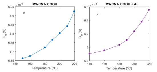 A further characterization was carried out to evaluate the temperature dependence of the baseline conductance (G0) of the tested materials in air. The results obtained for one of the films before and after the Au functionalization are shown in Figure 9. According to the results obtained from the material characterization, the selected temperature range does not exceed 220 °C in this work.