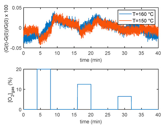 which reduces with increasing temperature. For both tested materials, this parameter goes from 6% at 120 °C to 4% at 220 °C, showing a more critical situation at low temperature. Below 150 °C the recovery time of both the sensing materials becomes too large for any practical applications.
