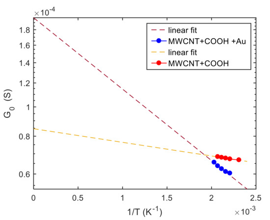 As shown in Figure 9, the measured conductance values increase with temperature in the range considered in this paper (T ≤ 220 °C), this suggests that the contribution of the metallic term in Equation (14) could give a negligible contribution, and that, as a first attempt, a simplified model for the conductance can be used to fit data. This result is consistent with other findings in the literature, e.g., [34]. Under this assumption, the film conductance could be described by the following equation: