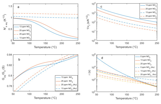 Steady state performance of the tested materials as a function of the working temperature: (a) estimated at two different gas concentrations (Equation (24)); (b) normalized sensing film conductance (at the equilibrium); (c) inverse of the adsorption rate for two different gas concentrations; (d) time constants in the presence of two gas concentrations and in the absence of NO2 as per legend.