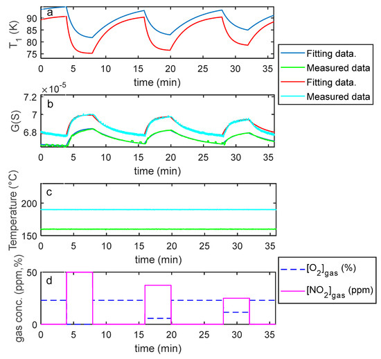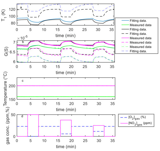 Results of the model fitting for an Au decorated MWCNT–COOH sensing film. From the top: the first plot (a) shows the estimated T1 as a function of time (model output), the second plot (b) compares the estimated G(t) (model output) with the measured one as per legend, the third (c) shows the measured temperature (model input), the last (d) the gas concentrations (model inputs).