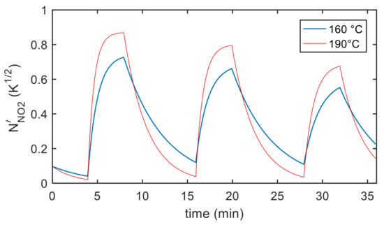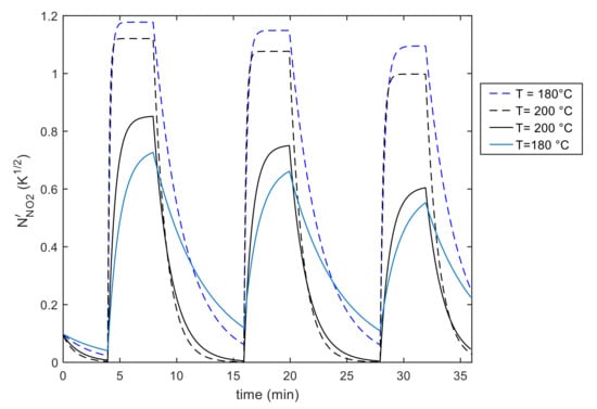 where is the rate of chemisorption at the reference NO2 concentration, and is the rate of chemisorption that depends only on temperature and gas concentration, whereas , being is the rate of desorption, which varies with temperature, with the target gas concentration and depends on the adsorbate surface concentration. As it can be seen from Equation (23), is a time, that depends on the temperature and gas concentration, it assumes the role of a time constant in steady working conditions and determines the response and recovery times. In detail, at fixed temperature the maximum value for the time constant is found when , i.e., with a NO2 concentration equal to 0, therefore the recovery time is always larger than the response time. On the other hand, the response time depends on the gas concentration: larger concentrations are characterized by shorter time constants.
