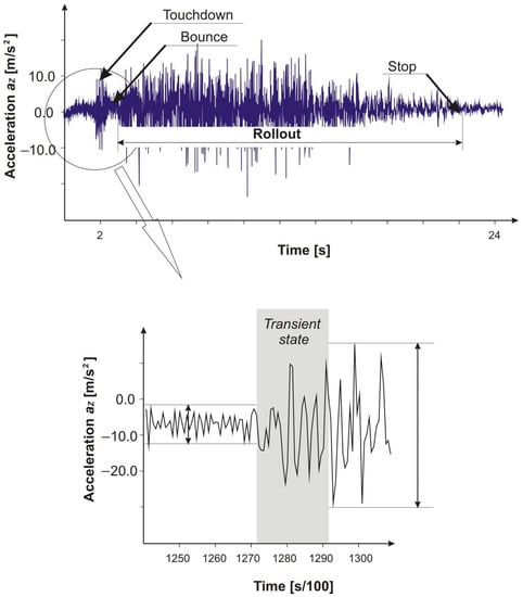At this point, it is worth taking a closer look at the transition state, shown in detail in the lower graph of Figure 1. This is the transition from the steady state for the approach at which the plane is still in the air and the vertical acceleration az reaches values of small amplitude. Then, a state is established at which the amplitude of the az acceleration value becomes significantly greater, as the airplane wheels roll on the grass runway surface, which causes intense vibrations. The transient state lasts about 200 ms and is characteristic for each of the recorded waveforms (each landing). At the touchdown speed of approx. 28 m/s, the airplane travels a distance of approx. 5.6 m during 200 ms.